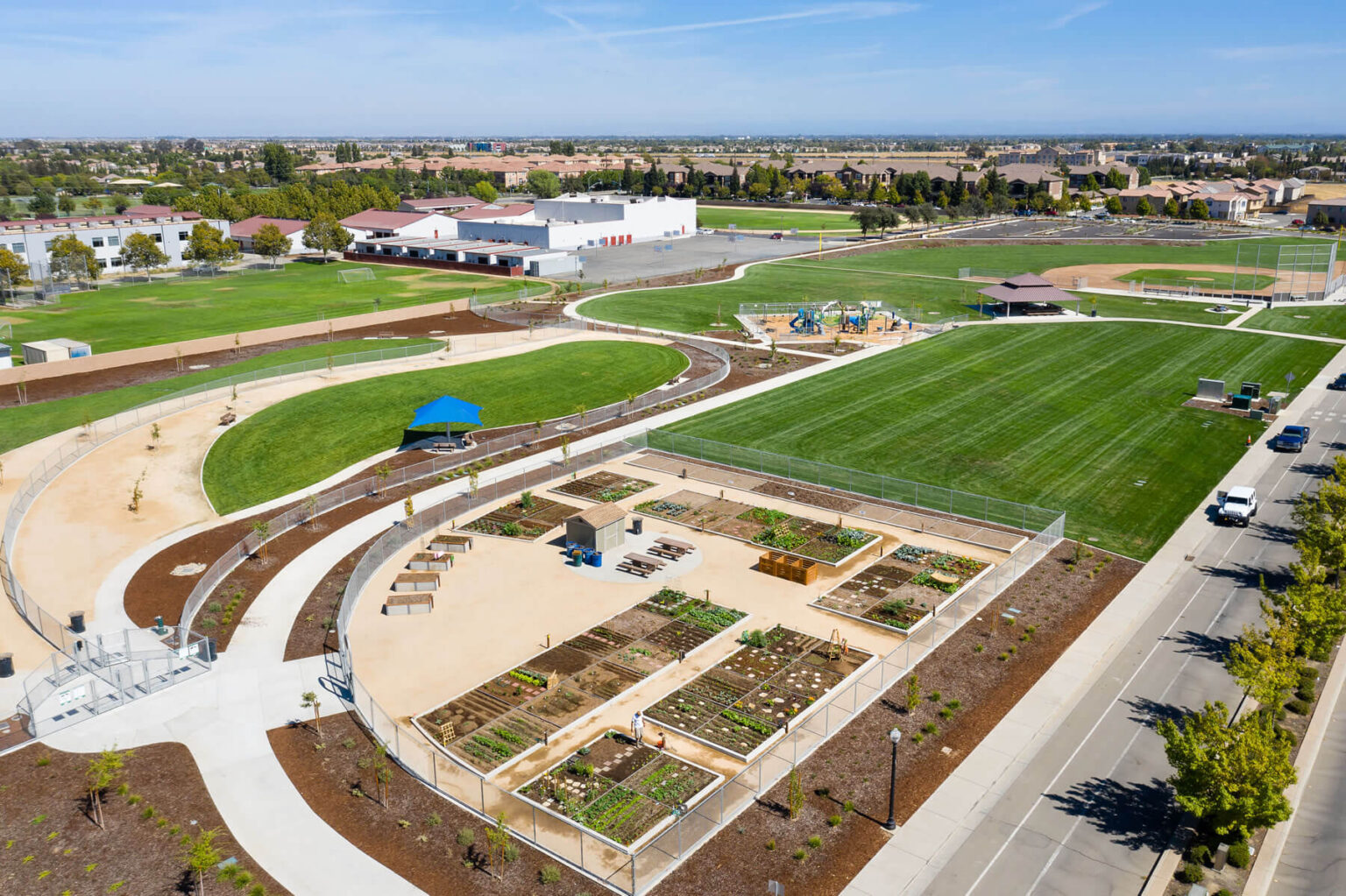 Bothman constructed a 9.9‐acre community park in North Natomas that includes a 300’ baseball field with team dugouts, bullpens, bleachers, and scoring table. The park includes a community garden, group picnic areas, a children’s playground, two dog parks with shade canopies, benches, drinking fountains, and natural turf and decomposed granite areas. The park also has a 79‐space parking lot.